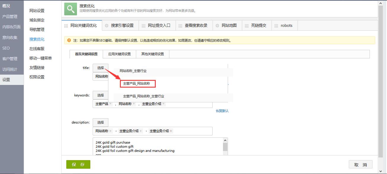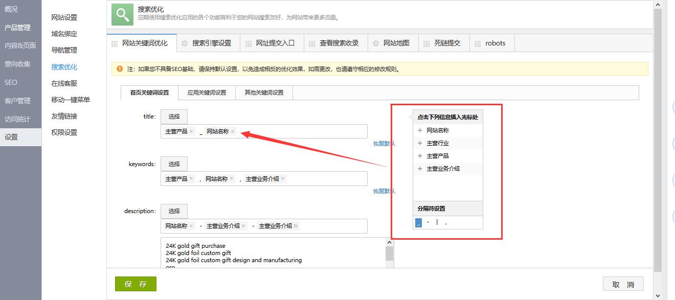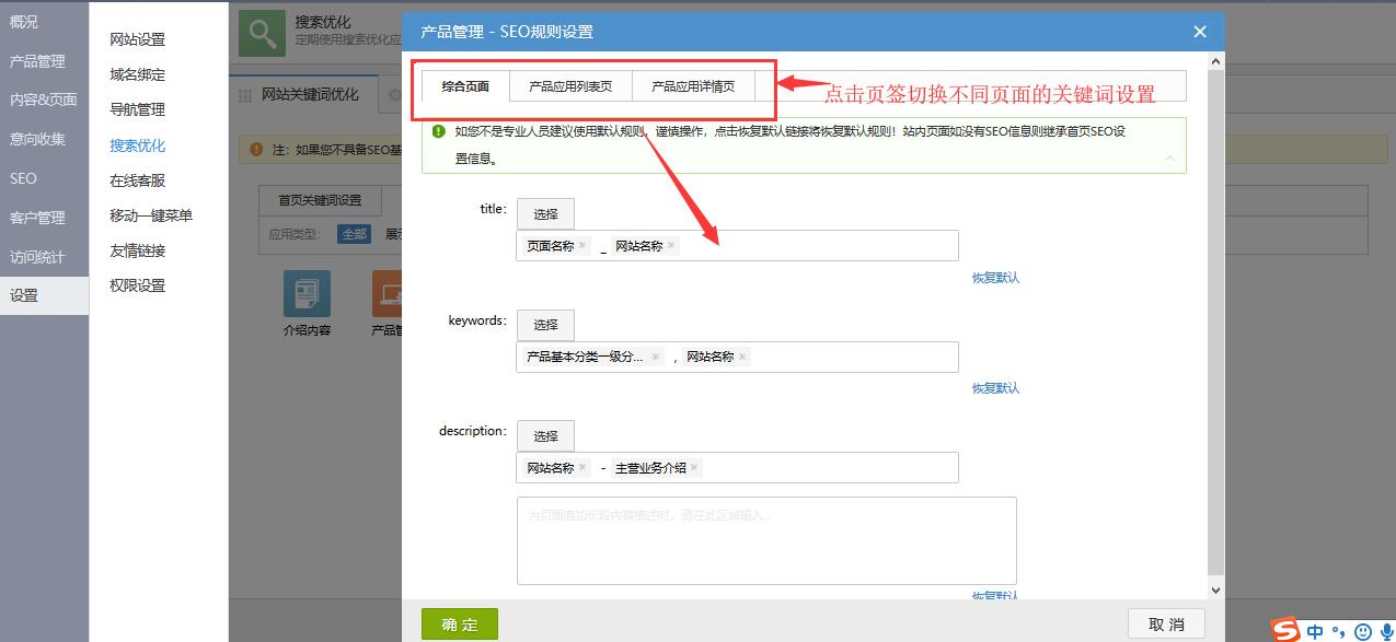 2.可编辑首页的关键词规则,可点击每个输入项前的 按钮选择系统推荐的关键词规则方案,点击“恢复默认”链接即可恢复到初始默认规则,选择关键词方案