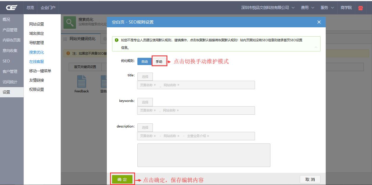 4.点击需要设置关键词规则的页面,出现弹窗,默认为自动规则,即沿用系统规则,如需自定义维护则点击“手动”按钮切换到手动编辑模式,其操作同首页