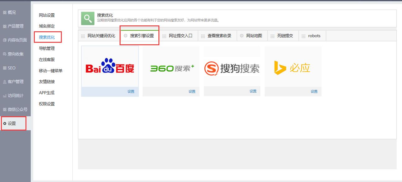 1.进入搜索优化应用,点击“搜索引擎设置”页签即可切换至搜索引擎设置页面