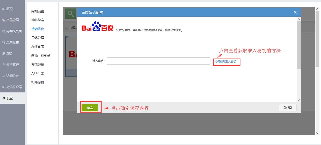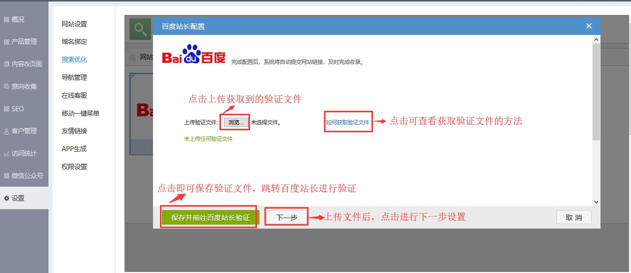 3.首先上传验证文件到网站根目录,其次其次填写准入密钥或者填写自动收录代码