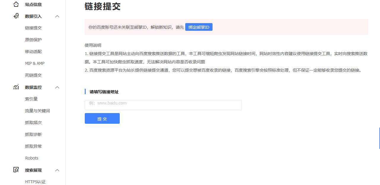 1.进入搜索优化应用,点击“网址提交入口”页签即可切换网址提交入口页面