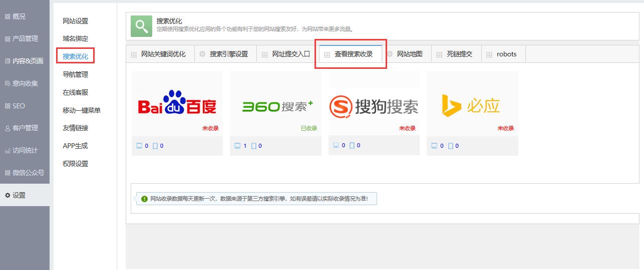 查看搜索收录的目的是方便客户从后台了解自己的网站在各大搜索引擎中的真实收录情况,使用该功能可以直接观察百度等搜索引擎的实时收录情况。(目前暂时仅开通了百度搜索引擎的查看搜索收录功能)