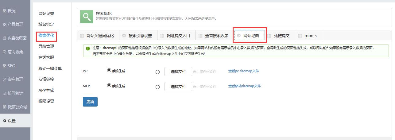 2.点击“更新提交网站地图”按钮,则更新当前网站页面并提交网站地图,返回更新结果