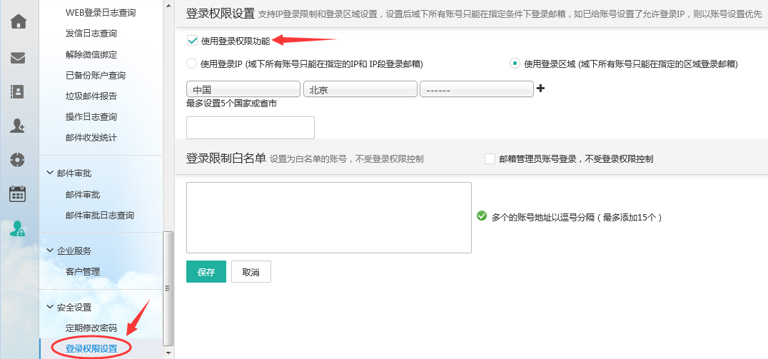 开启方法:登录邮箱管理员后台,安全设置-登录权限设置-开启登录权限功能,选择限制登录ip或者登陆区域。
