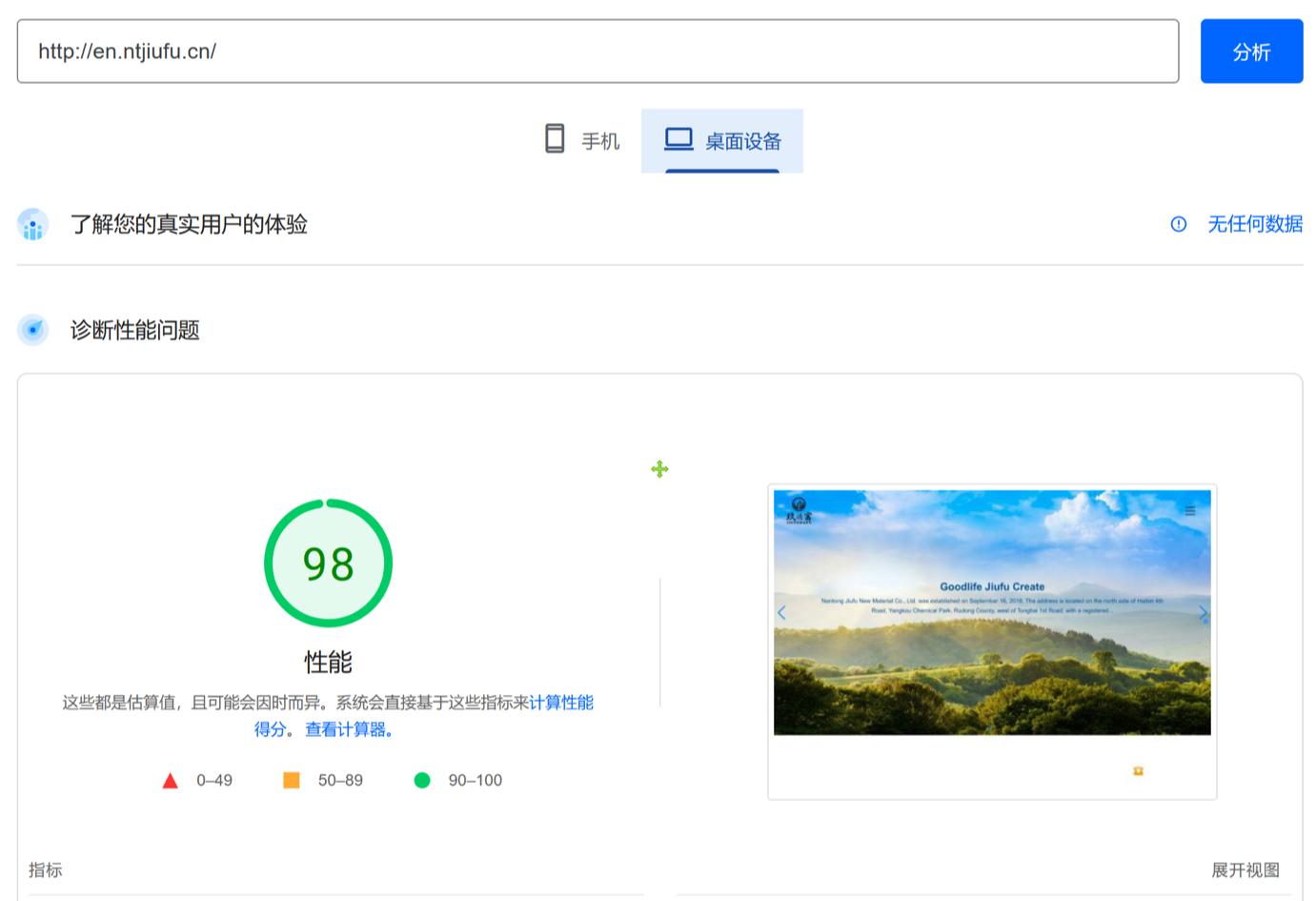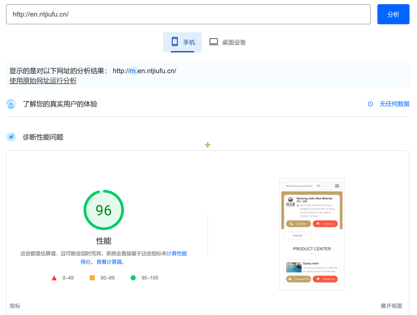 中企动力服务团队于22年4月份为南通玖富新材料有限公司刚刚完成上线的网站,不到1个月时间即在google收录,并获得98分的高评分,为双端高品质网站,使海外客户轻松搜到并建立咨询联系,超出客户预期。
