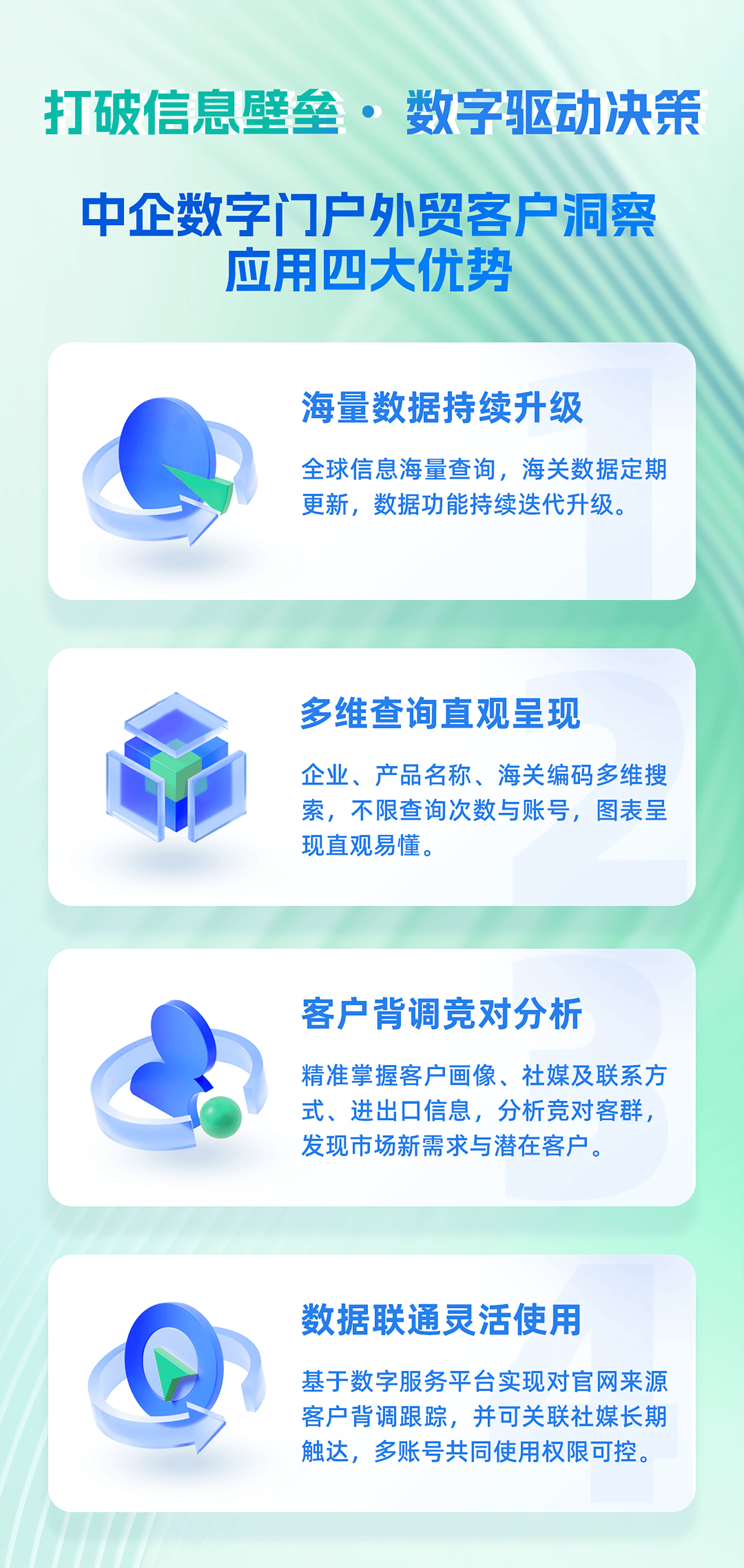 助力外贸企业洞察外贸趋势,挖掘潜在商机,掌握客户、竞对动态,提升决策效率,扩大市场前景,提高核心竞争力